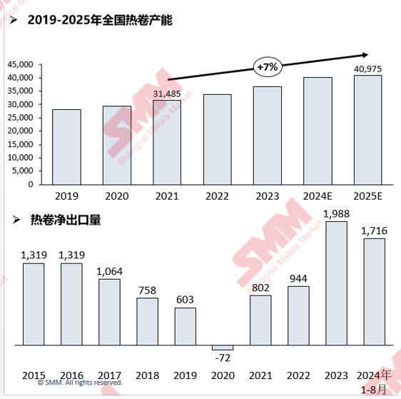 SMM预计,2025年开始,热卷新产能投产增量将有所减少。若年度产量在1.9亿吨左右,内需缺口预计为3000万吨。
